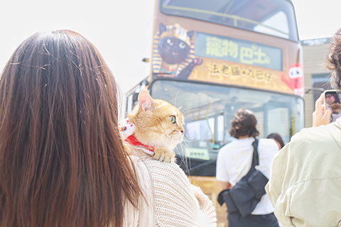 記者當天登上「九巴法老貓號」版的寵物巴士。有市民右手抱著由香港故宮文化博物館推出的法老貓文創,左手抱著自家小貓,在巴士上合影留念,享受與愛寵相處的時光。