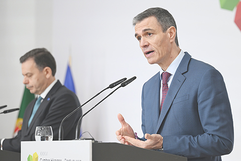 ◎ 西班牙首相桑切斯三月六日表示,美國和以色列對伊朗的軍事行動是「極其嚴重的錯誤」。他同時強調,西班牙向塞浦路斯派遣軍艦僅為履行對歐盟伙伴的防禦和援助義務。圖為當日,在西班牙韋爾瓦省拉拉比達,西班牙首相佩德羅·桑切斯(右)在西班牙-葡萄牙峰會新聞發佈會上講話。(新華社發西班牙首相府供圖)