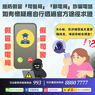 【特訊】司警局防騙熱線及反詐程式於昨日(三月八日)分別接到十多名市民提供犯罪消息,報稱收到騙徒以粵語自稱「司法警察局」、「郵電局」人員的詐騙電話。騙徒會以偽造的本地手機號碼致電市民,部份騙徒更可準確講出市民的真實姓名,並訛稱其「登記的手機號碼發送了大量違法、違規訊息」;起初騙徒會佯裝要求事主親自前往司警局配合調查,及後又會以方便市民為由表示進行「線上辦案」即可。
