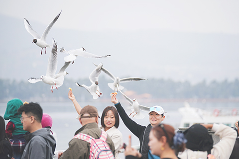 越冬紅嘴鷗即將飛離昆明 2026-03-11 03:30:00 ◎ 隨著天氣回暖,在昆明越冬的紅嘴鷗頭部羽色由白轉黑,逐漸換上夏羽,並將陸續飛回西伯利亞等棲息地。圖為三月十日,不少市民和遊客來到滇池邊,與紅嘴鷗親密互動,為這些即將遠行的「老朋友」送行。(中新社記者 劉冉陽 攝)