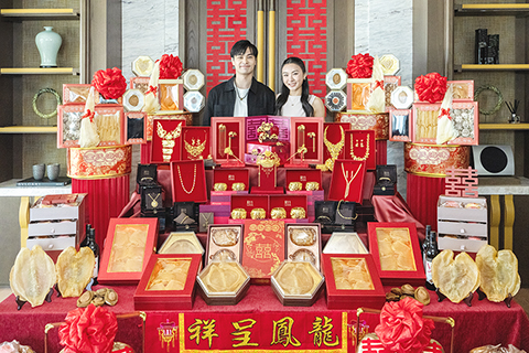 【特訊】香港女子跳高紀錄保持者楊文蔚(Cecilia)去年宣布喜獲青梅竹馬、拍拖12年牙醫男友孔軍凱(Daryl)求婚,兩人準備迎來人生新篇章,共諧連理。Cecilia雖為年青新世代,但對傳統儀式依然格外重視,3月8日與未婚夫及家人進行了隆重的「過大禮」儀式,各式聘禮當中一系列周生生金飾成為矚目焦點,包括四對重磅龍鳳鈪、精緻鳳冠、多條足金頸鍊,與一系列時尚金飾,象徵滿滿祝福。