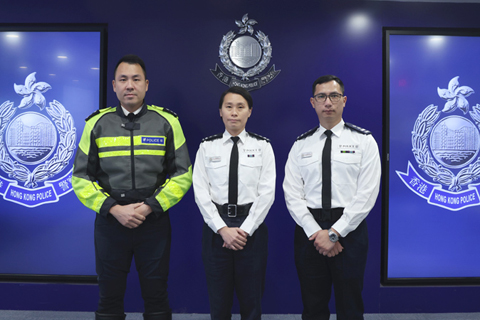 ◎ 三月十三日,香港警方在警察總部舉行簡介單車百萬行二0二六特別交通記者會。圖為新界南總區行動部高級督察楊慧嫻(中)、新界南總區交通部執行及管制組高級督察張浩煒(左)、青衣分區行動支援小隊指揮官陳家銘(右)出席記者會。(香港中通社記者鄧梓傑 攝)