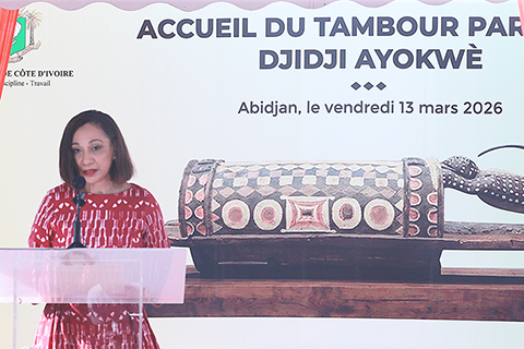 ◎ 科特迪瓦埃布里耶族聖鼓「吉吉.阿約克韋」三月十三日順利抵達阿比讓國際機場。作為科特迪瓦請求法國歸還的一百四十八件文化遺產中的第一件,聖鼓的回歸被視為科特迪瓦在文化遺產保護與歷史記憶方面取得的重要成果。圖為當日,在科特迪瓦阿比讓,科特迪瓦文化與法語國家事務部長弗朗索瓦絲·雷馬克在儀式上講話。(新華社發 伊萬.宋 攝)