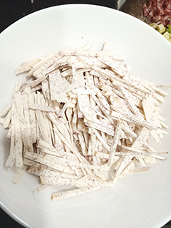 首先把芋頭切成長幼條,放盆中用少許鹽水,醃十五分鐘上下變柔軟;切臘腸粒與蝦米炒香,放入芋頭絲內,再放少許澱粉、五香粉,帶膠手套攪拌所有材料。