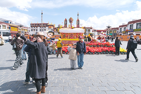 當前正值藏曆一月,大昭寺廣場仍保留著濃厚的「年味」,巨型切瑪盒(藏曆新年吉祥物)前,不少市民、遊客以及朝佛信眾駐足合影。