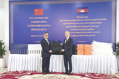 中方援柬警用物資交接儀式在金邊舉行 2026-03-18 03:30:00 ◎ 中國公安部向柬埔寨打擊網絡詐騙委員會秘書處援助物資交接儀式三月十六日在金邊舉行。柬國務大臣蔡西那烈、中國駐柬大使汪文斌出席並致辭。圖為當日,在柬埔寨首都金邊,柬國務大臣蔡西那烈(左)與中國駐柬大使汪文斌出席交接儀式。(新華社發 萬坡 攝)