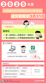 另根據第35/2026號經濟財政司司長批示,倘收益從多於一位僱主處取得的職業稅第一組納稅人,又或不具備適當編製會計的職業稅第二組納稅人,遞交2025年度職業稅M/5格式收益申報書的期限延至3月31日。