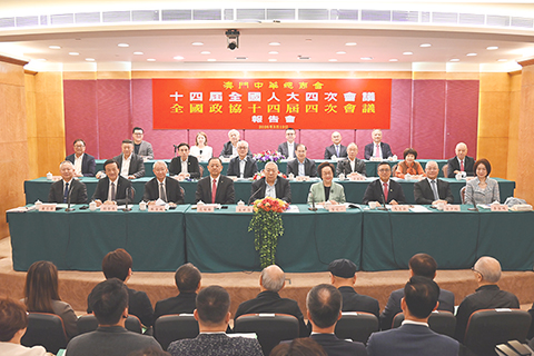 【特訊】澳門中華總商會昨日下午六時在會址舉行「十四屆全國人大四次會議、全國政協十四屆四次會議報告會」。報告會由全國政協常委、中總會長崔世昌主持。全國政協委員、中總副監事長梁少培,全國政協委員、中總會董李佳鳴,全國人大代表、中總副會長劉藝良,全國人大代表、中總副理事長蕭志偉,先後向與會的會長、會董、理事、監事報告「兩會」基本情況和暢談參加「兩會」的感受和體會。中總副會長范耀勝、賀定一、林金城,理事長馬志毅等逾百人出席報告會。