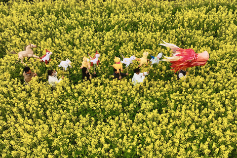 ◎ 三月二十一日,在黟縣碧山村一處油菜花田裡,黃睍豪和他的夥伴們一起舞動石亭燈綵。「00後」青年黃睍豪出身安徽黟縣竹篾加工世家,自幼耳濡目染,精通竹篾技藝。大學畢業後,他返鄉傳承徽州非遺石亭燈綵,並融入現代創意讓傳統技藝煥發生機。如今,他與一眾創業青年紮根碧山村,以創意與實干為鄉村振興賦能。(無人機照片)(中新社記者 韓蘇原 攝)
