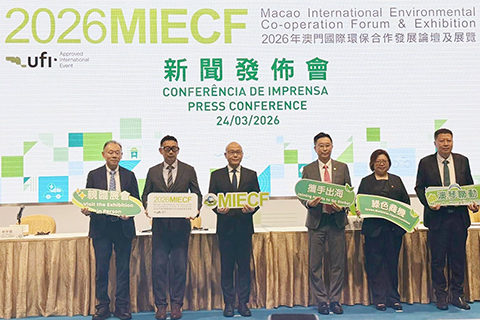 二零二六MIECF新聞發佈會昨日(三月二十四日)舉行,由官方承辦單位及相關參與機構介紹展會內容,並安排傳媒參觀展會搭建情況。澳門特區招商投資促進局主席謝永強、環境保護局局長葉擴林、招商投資促進局委員黃伊琳、環境保護局副局長韋海揚,以及二零二六MIECF項目經理代表何海明與大會總承建代表林中賢出席新聞發佈會。