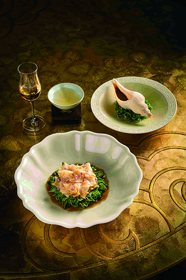 「金殿堂」將呈獻四道以「鳳凰茶語」入饌的佳餚,「麥卡倫威士忌拌香辣海螺片」以威士忌取代傳統黃酒,酒香辛韻與螺片的脆爽鮮甜於舌尖交織;「麥卡倫威士忌酒香桃仁星斑卷」選用東星斑,配以烘香桃仁,口感爽彈,伴隨淡雅酒香。「酸菜茶燻和牛臉頰佐麥卡倫威士忌」則嚴選油脂豐潤的A5和牛面頰,乾煎至外香內嫩,並於席前以「鳳凰茶語」威士忌沿鍋邊淋澆,令酒韻與鍋?的鳳凰單叢烏龍茶葉及青胡椒粒相映交融,隨著熱氣瞬間升騰,茶燻與醇香縈繞交織,酒香頃刻瀰漫席間,餘韻悠長。甜點「洛神花果凍伴麥卡倫威士忌」則以晶瑩果凍配搭洛神花的清新酸甜,食用前淋上用威士忌特調的黑糖漿,醇厚酒香與花果的清雅在舌尖輕舞,為整場饗宴劃上優雅句點。