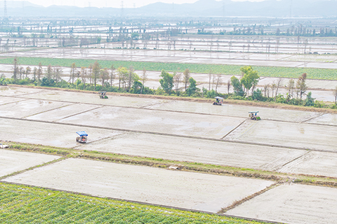 ◎ 三月廿四日,在廣東江門台山市都斛鎮,工作人員操作插秧機在田間插秧(無人機照片)。近日,位於廣東江門台山市都斛鎮的「廣東第一田」核心產區啟動最後一批絲苗米秧苗插秧工作。台山擁有連片優質水田面積一萬五千公頃,核心產區涵蓋都斛、赤溪、鬥山等鎮,連片水田比例位居全省前列,有著「廣東第一田」的美譽。近年來,台山通過科技賦能,推動傳統農耕向「智慧種糧」蛻變,水稻機插率達百分之九十四點五,耕種收綜合機械化率百分之九十八點三五。(新華社記者 毛思倩 攝)