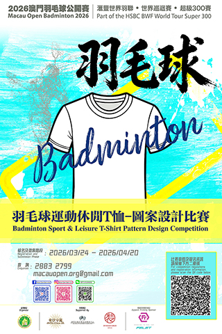 【特訊】為提升2026澳門羽毛球公開賽的品牌影響力與社會關注度,激發全澳創意人士的創作熱情,由澳門羽毛球總會主辦,金沙中國有限公司、澳門生產力暨科技轉移中心、澳門時裝設計行業協會支持及FELET服裝印刷贊助的「2026澳門羽毛球公開賽·滙豐世界羽聯·世界巡迴賽·超級300賽-羽毛球運動休閒T恤-圖案設計比賽」3月24日起正式報名及徵集!