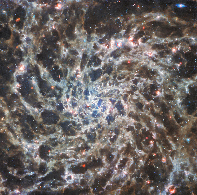 哈伯望遠鏡影像突顯了星系中被暗區分隔開的巨大旋臂,而韋伯望遠鏡影像則展現了更細緻且盤根錯節的結構。星際塵埃會散射並吸收星系中恆星的光,在哈伯影像中形成了暗塵埃帶,並在紅外波段以熱輻射方式釋放熱量,因此,在韋伯望遠鏡影像中塵埃會發光。詹姆斯·韋伯望遠鏡上的中紅外線儀器(MIRI)需要在-266ºC(相當於-447ºF)的極低溫度下運行,否則它會探測到望遠鏡自身發出的紅外線輻射。結合這些觀測,天文學家得以把小尺度的氣體與恆星連結到真正龐大的星系結構與演化尺度。