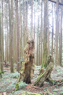 在阿里山的巨木群中,千百年來被砍伐後遺留下的檜木樹根,依然牢牢護住這片土地,形狀各異、各具美態,令人讚嘆大自然的鬼斧神工。根據當地人的介紹,阿里山的千年紅檜樹心部位常可見空洞,因為樹皮內的韌皮部和形成層能上下輸送水分和營養,使千年老樹得以保持生機,展現舊貌新顏。