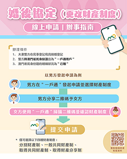 在民事登記方面,推出線上辦理婚後協定服務。以往辦理婚後協定需要至少夫妻任一方先到民事登記局申請,其後雙方須於約定日期親臨登記局簽署婚後協定。新服務實施後,符合資格的夫妻只需在「一戶通」共同提交婚後協定申請,經登記局審批及登記後,即完成變更財產制度的手續,免除親臨申請和簽署的步驟。
