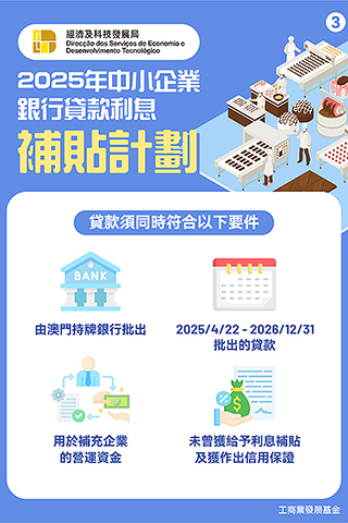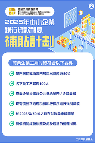 「2025利息補貼計劃」詳情可瀏覽經科局網頁(https://www.dsedt.gov.mo/zh_MO/web/public/pg_sme_bjcf)。如有任何查詢,可電郵至bjf@dsedt.gov.mo,亦可於辦公時間致電28882088或透過微信服務號「DSEDTONLINE」與經科局聯繫。◇