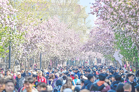 ◎ 四月四日,遊客在天津市五大道歷史文化街區遊覽賞花。近日,天津市五大道歷史文化街區大理道的海棠花競相綻放,吸引眾多遊客前來賞花遊覽。為進一步激活「春日經濟」,天津市和平區於四月三日至十二日舉辦二0二六年五大道海棠花節,為市民遊客奉上一場春日文旅盛宴。(新華社記者趙子碩 攝)