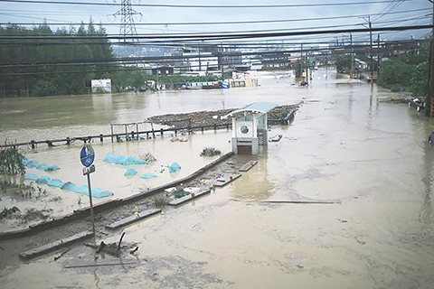 ◎ 台灣受鋒面過境影響,四月四日苗栗地區一夜之間降下破百毫米大豪雨,導致多處地區嚴重積水成災,路面完全被黃土色泥水淹沒,車輛無法通行。市區道路同樣災情慘重,有騎士冒險涉水行經淹水路段,激起劇烈浪花,積水深度已危及行車安全。(香港中通社圖片)