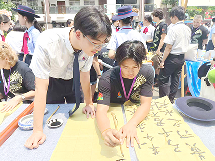 文化的交匯,不止於手藝之間,更深入課堂之中。七年級的語文課上,兩國學生一同誦讀簡單詩詞;八年級的歷史課上,他們互相分享各自的文化小故事。