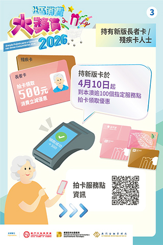 本澳即將進入風雨季節,天氣變化頻繁,本次消費立減優惠使用期(4月10日至6月18日)充裕,經科局與社工局呼籲長者及持殘評證人士應在確保出行安全的前提下,選擇合適時段前往服務地點辦理相關申領手續。◇