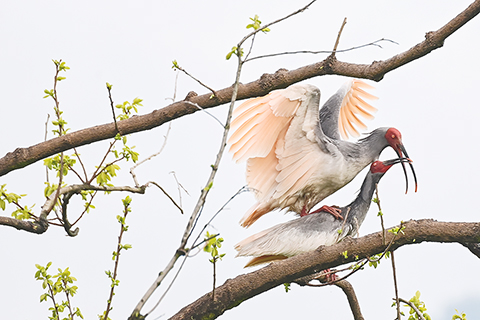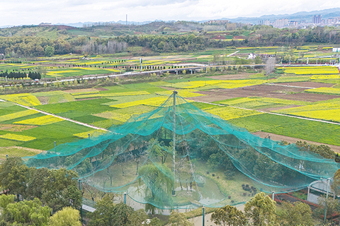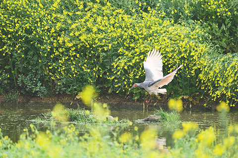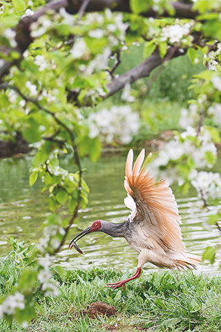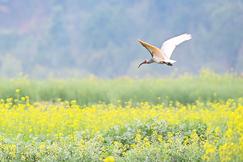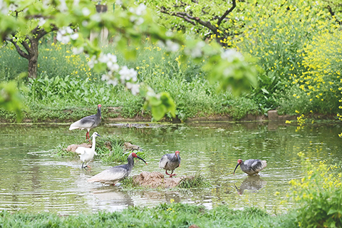 每年春天,「朱䴉之鄉」陜西省漢中市洋縣迎來朱䴉繁育季。在朱䴉國家級自然保護區朱䴉人工繁育中心周邊村落的油菜花田與林間,野生朱䴉銜枝築巢、覓食嬉戲的身影隨處可見。