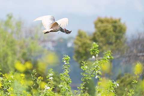 ◎ 三月三十日,朱䴉從洋縣草壩村的梨樹上方飛過。(新華社記者鄒競一 攝)