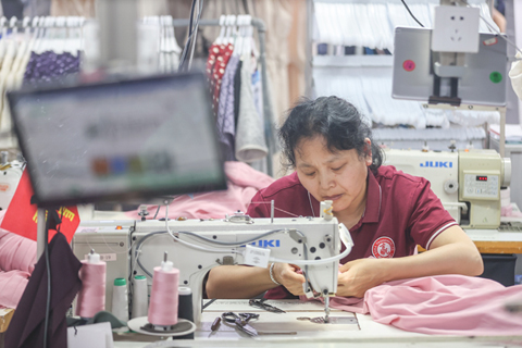 四月九日,江西贛州于都縣,一家時裝公司的智慧工廠車間內,工人趕製夏裝,工位上方的平板終端會實時顯示工序、工藝標準等生產信息。該企業近年來依託5G、大數據和工業互聯網等技術,搭建起集智能設計、柔性生產、精準管理、個性定製於一體的智慧工廠體系,生產效率大大提升。◇(中新社記者 劉力鑫 攝)