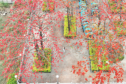 火紅木棉扮靚福州 2026-04-16 03:30:00 ◎ 四月十五日,福州閩江公園內木棉花競相綻放。福州公園、街道種植的木棉樹相繼迎來盛花期,為城市增添了一抹絢麗色彩。(無人機照片)(中新社記者呂明攝)