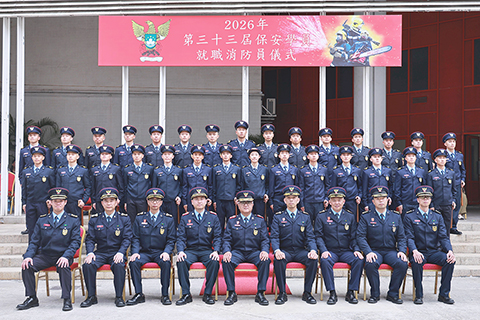 是次就職共29名消防員,他們均完成第三十三屆保安學員培訓課程,通過各項考核,正式成為消防員;儀式中亦分別向課程中成績優異的人員頒發獎狀,獲得第一名的是消防員張雪琳;第二名是消防員吳振榮;第三名是消防員謝林康。◇