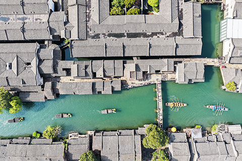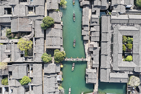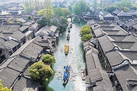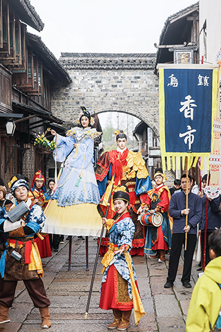 ◎ 四月一日,烏鎮香市蠶花盛會的巡遊隊伍在古鎮的街市上巡遊表演。