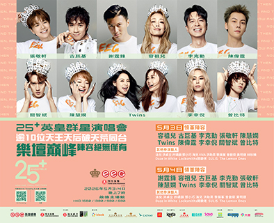 由英皇娛樂主辦、恒生保險冠名贊助,英皇鐘錶珠寶、英皇金融、Keeta及國泰聯合呈獻的「恒生保險呈獻:25+英皇群星演唱會」繼早前宣佈5月4日表演藝人名單後,大會正式公佈5月3日場次陣容,包括容祖兒、古巨基、李克勤、張敬軒、陳慧嫻、Twins、陳偉霆、李幸倪、關智斌、曾比特等。超過十位樂壇天王天后首次同台啟德,陣容勁絕無僅有。