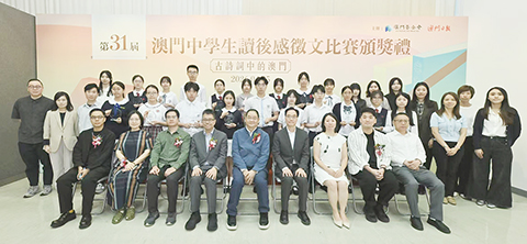 【特訊】由澳門基金會與澳門日報合辦的第三十一屆「澳門中學生讀後感徵文比賽」反應熱烈,本屆以「古詩詞中的澳門」為主題,共收到二十七間學校四百三十九份參賽作品。頒獎禮已於二0二六年四月二十五日在澳門教科文中心舉行,主辦單位向二十位獲獎學生頒發獎座,以示鼓勵。澳門基金會行政委員會主席吳志良,澳門日報總編輯崔志濤,高中組評判谷雨、陸奧雷,初中組評判譚健鍬、林格,以及各校校長、老師、獲獎同學及其家長出席典禮,場面熱鬧。