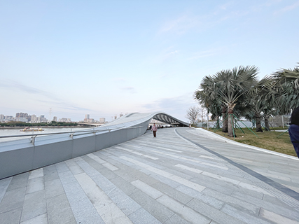 站在這里向西望去,獵德大橋、珠江新城的摩天群樓、小蠻腰(廣州塔)與海心沙等地標盡收眼底;向東則是另一片商業競逐之地,騰訊、阿里、小米等高新企業的辦公大樓在夜間以燈光表演點綴城市天際,將琶醍的時尚氣息融入蓬勃的江水文化與夜經濟中。外露的鋼架結構、炫目的燈光設計與工業風廣場,縱橫交錯的綠地花木,一同構成溫情又浪漫的開放空間。