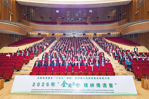 【特訊】為深入學習貫徹二0二六年全國兩會精神,準確把握國家「十五五」規劃綱要的戰略部署,特區政府昨(二十七)日在澳門大學會堂舉辦二0二六年全國兩會精神傳達會,由行政法務司司長黃少澤、中央政府駐澳門聯絡辦公室副主任張應杰、澳區全國人大代表團團長劉藝良和全國政協常委何潤生作專題分享,約四百五十名特區政府領導及主管官員出席。