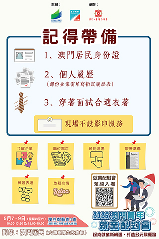 【特訊】為協助澳門青年順利開展職業生涯及投入就業巿場,由教育及青年發展局和勞工事務局主辦,並由澳門工會聯合總會承辦的「澳門青年就業配對會」(下稱配對會)及「澳門青年職前輔導會」(下稱職輔會)將於5月7日至9日一連三日於澳門綜藝館舉行。配對會及職輔會兩項活動由即日起可於網上預約及報名。