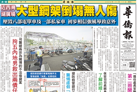 【專訪】近西灣湖廣場昨早有大型鋼架倒塌,該寫有「澳門美食節」的大型鋼架,壓毀八部停泊路邊的電單車及一部私家車,事件中無人受傷。治安警及消防接報到場處理,初步相信強風導致意外。 現場消息指,昨日早上約十一時,西灣湖景大馬路美食節位置附近一個面積約三十米乘七米的大型鋼架倒塌,壓毀多部車輛。治安警及消防…